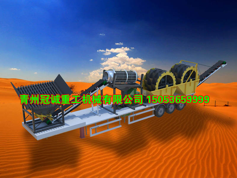 本套移動(dòng)破碎站為移動(dòng)式制沙水洗設(shè)備,處理量為每小時(shí)100-120立方(150-180噸)??梢允褂冒霋燔囶^或者挖掘機(jī)、裝載機(jī)等牽引車輛輕松移動(dòng)到工作場地。本移動(dòng)破碎站是青州冠誠重工機(jī)械有限公司獨(dú)立設(shè)計(jì)制作而成,直接采用17.5米半掛車底盤改裝制作,基優(yōu)勢如下: