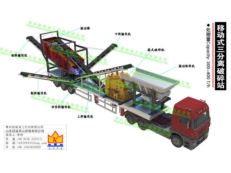 本套移動破碎站為移動式三次分離破碎制砂設(shè)備,處理量為每小時60-100立方,本移動破碎制砂設(shè)備是青州冠誠重工機械有限公司獨立設(shè)計制作而成,直接采用17.5米半掛車底盤改裝制作,基優(yōu)勢如下: