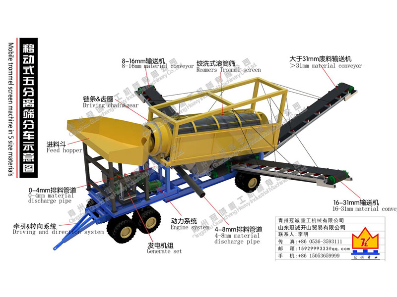 移動(dòng)式五分離篩分設(shè)備,發(fā)電機(jī)組集成在底盤(pán)上,附帶牽引&轉(zhuǎn)向系統(tǒng),可以使用牽引車(chē)輛輕松移動(dòng)至工作場(chǎng)地;其中篩分系統(tǒng)使用了新型核心技術(shù)的絞洗式滾筒篩,其優(yōu)勢(shì)如下: